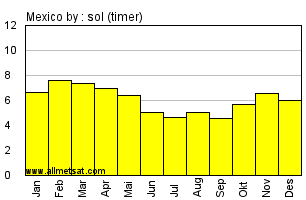 | Månedlig gjennomsnittlig antall timer med sol pr. dag. |